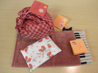かわいいイチゴ柄のは、端切れを四角にふち縫いしてくれています。
