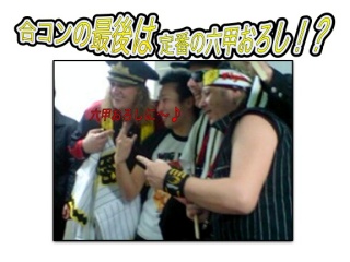 WIG WAMと合コン④ 2007-03-02 合コンも終盤になってきましたー!当選されたファンの方がタイガースのハッピと鉢巻を持参し、定番の六甲おろしをWIG WAMと一緒に歌っています♪ Tweet