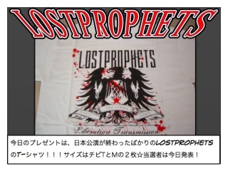 今日のプレゼント・・・ 2007-02-16 今日のプレゼントは、日本公演が終わったばかりのLOSTPROPHETSのTシャツを2名様にプレゼントー!!サイズはちびTとM。当選者は今日発表ー!応募ガンガン待ってるぜ! Tweet