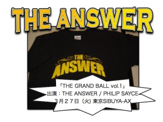 今日のプレゼント!! 2007-02-02 今日は、3月27日(火)東京、SIBUYA-AXで行われる「THE GRANDE BALL vol.1」に出演するTHE ANSWERのT-シャツを1名様にプレゼント!!サイズはS!!当選者は今日発表!ガンガン応募まってるぜ☆ Tweet
