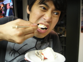 スタッふ〜の観察日記87【7/6その③】 2012-07-07 みんなでケーキをおいしくいただいたのですが・・・ うちの番組プロデューサー・・・メロイックサインはうまくできないけど、ケーキの食べ方は、なんだかロックです Tweet
