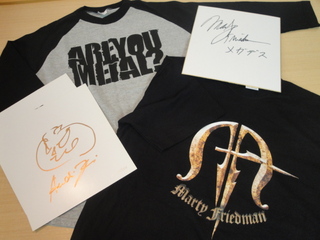 今日のプレゼントは・・・ 2011-10-07 HelloweenとROCK ONのコラボレーションTシャツにアンディ・デリスのサイン色紙をセットにして2名に(サイズは、SとXS) Marty FriedmanのTシャツにMartinのサイン入り色紙をセットにして1名に(サイズはM) Tweet