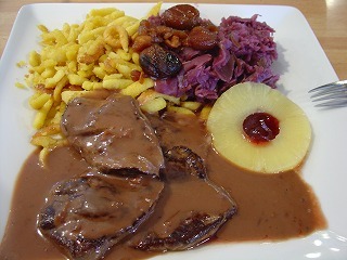 レストランではこういった狩猟料理が出されます。画像の料理はシカのステーキです。添え物として栗の実や赤キャベツ、ドイツのシュヴァーベン地方の郷土料理、シュペッツレと共に。